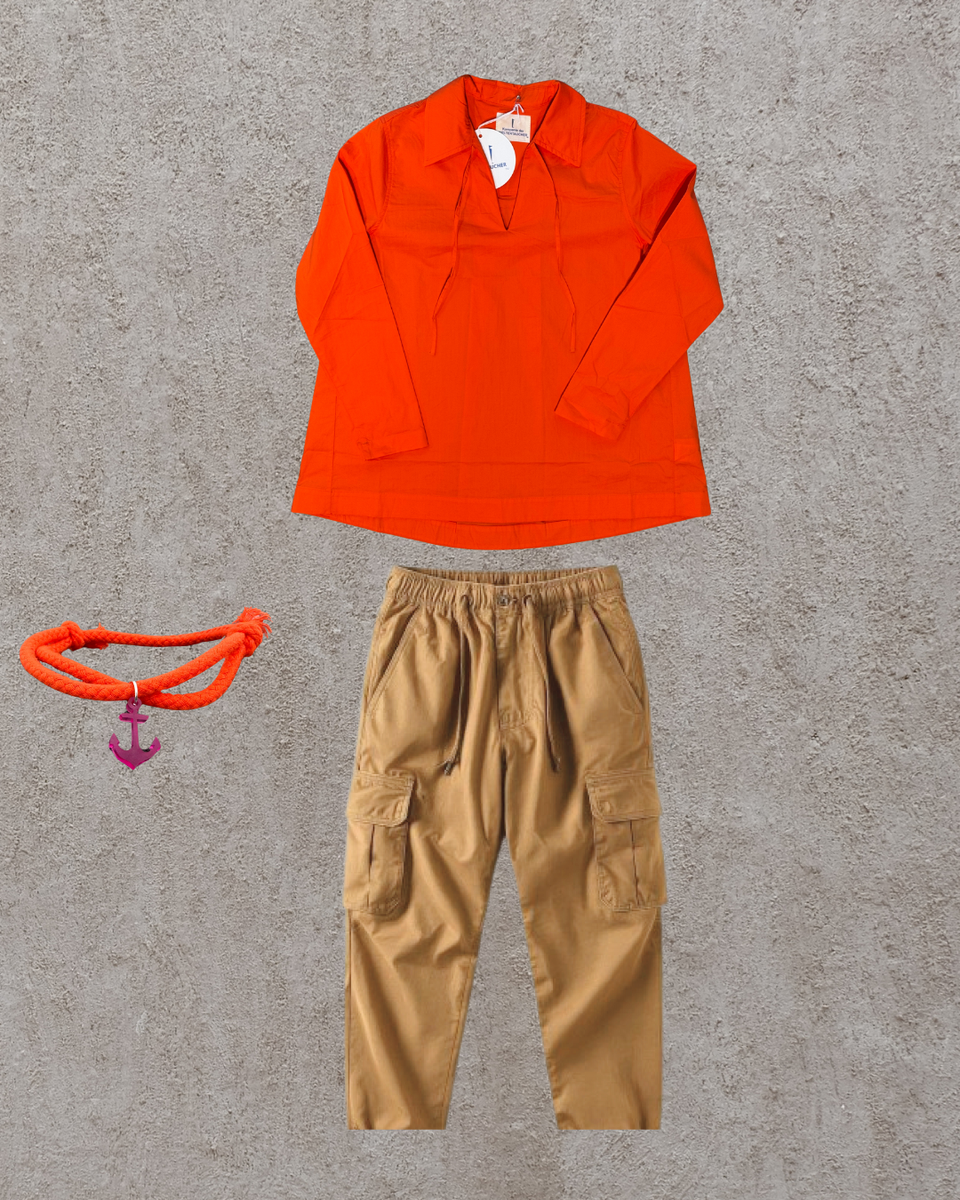 Braune Cargopants bringen den coolen lässigen Vibe, die edle Popelinebluse in Orange setzt einen strahlenden, femininen Kontrast. Ein Look zwischen lässiger Stärke und raffinierter Leichtigkeit. Modern, selbstbewusst und voller Charakter. Als kleinen Freudebringer gibt´s das Ankerarmband mit Kordel ans Handgelenk.