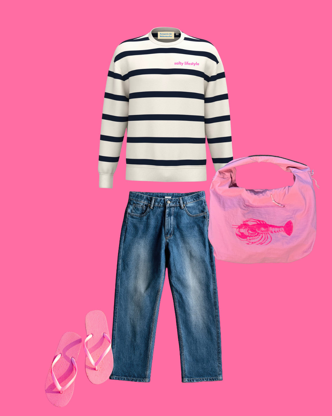 Blau-weiß gestreiftes Sweatshirt trifft auf lässige Jeans – ganz klassisch nordic vibes. Dazu pinke Flipflops und die Statement-Tasche mit Hummer als frecher Farbakzent. Ein Look wie ein Spaziergang am Meer, nur mit extra Attitude.