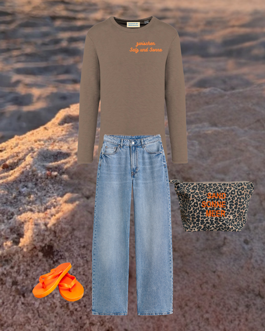 Entspanntes Braun-Beige als ruhige Base, dazu frische Orange-Akzente für den perfekten Farbkick. Unkompliziert, modern und genau die richtige Mischung aus cozy & cool. Und wer es ein bisschen wild mag, nutzt die kleine Kulturtasche einfach als Clutch und It-Piece zum lässigen Outfit.